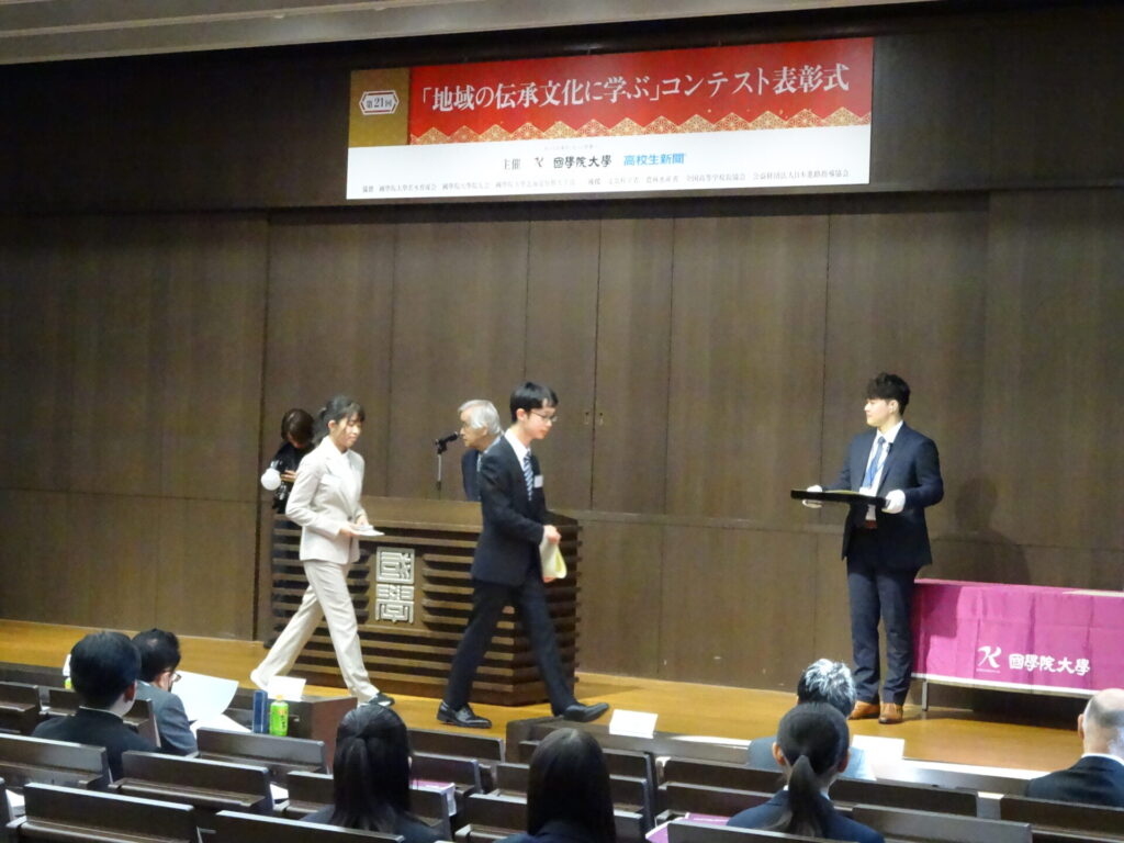 12月7日、第21回「地域の伝承文化に学ぶ」コンテスト(國學院大學・高校生新聞社)表彰式が國學院大學で行われました。審査の結果、3年生の宮内晴さん、小野真実さん、横山慧さんの『諏訪地域の社と小宮祭―地域の御柱―(Ⅱ)』が地域文化研究部門(団体)で佳作に入賞しました。諏訪地域では諏訪大社の御柱以外にも道端の小さな祠や道祖神碑などの周囲に4本の柱が建っています。県内の他地域ではほとんど見られないこの柱の謎に迫ったのが彼らの探究活動です。先行研究が少ないため調査範囲を決めて社の悉皆調査を行いました。こうした地域の社で行う柱建てを小宮祭と呼びますが、実際に小宮祭を行っている氏子の方に祭りの継承に関する調査も実施しました。2024~2025年にかけて実施したこの調査が地域の記録として今後の小宮祭研究に生かされればうれしいです。